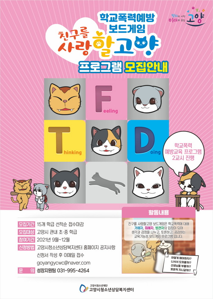 [부자동네타임즈 김인수기자] 재단법인 고양시청소년재단(이사장 이재준) 산하기관인 고양시청소년상담복지센터(센터장 황상하)는 심각하게 대두되는 있는 학교폭력을 예방하기 위해 강의식 위주가 아닌 놀이를 통해 체험과 학습을 할 수 있는 새로운 교육 콘텐츠 친구를 사랑할 고양 보드게임을 개발〮하였고, 9월부터 고양시 관내 초등‧중학교에 프로그램을 보급할 계획이다.