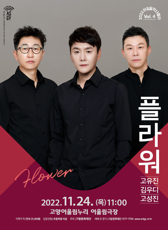 [부자동네타임즈 김인수기자] 고양문화재단(대표이사 정재왈)은 오는 11월 24일(목) 고양어울림누리 어울림극장에서 올해 아침음악나들이 마지막 프로그램으로 밴드 ‘플라워’의 무대를 선보인다. 고양어울림누리 대표 아침 콘서트 시리즈인 ‘아침음악나들이’는 매년 다양한 장르에서 활약하고 있는 보컬리스트의 무대를 선보여 오고 있으며, 지난 5월부터 뮤지컬 배우 정영주(5월)와 포르테 디 콰트로의 멤버 가수 손태진(7월), 로커 김정민(9월)의 무대를 성황리에 마쳤다. 올해 아침음악나들이 마지막 시리즈인 밴드 플라워의 무대는 2000년대를 아우르는 록발라드 곡들로 꾸며진다.