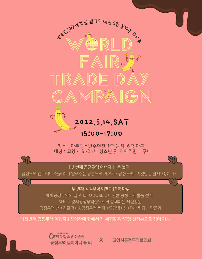[부자동네타임즈 김인수기자] 재단법인 고양시청소년재단 마두청소년수련관 공정무역 캠페이너 ‘플리’와 고양시공정무역협의회가 함께 기획하고 운영하는 2022년 세계 공정무역의 날 캠페인(World Fair Trade Day Campaign)이 오는 5월 14일(토요일) 오후 3시부터 5시까지 마두청소년수련관 1층 놀터와 6층 마루에서 개최된다.