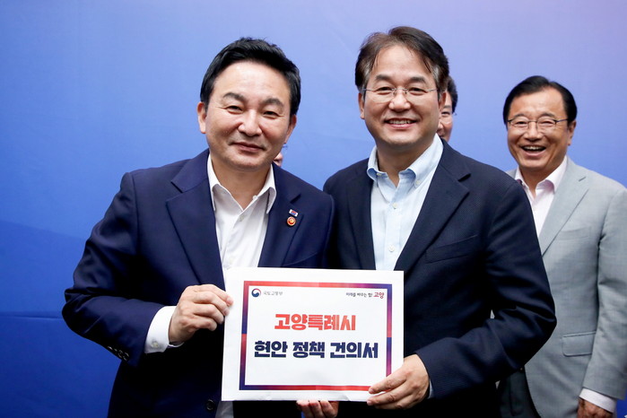 [부자동네타임즈 김인수기자] 지난 9일 화성시에서 열린 경기도시장군수협의회에 참석한 원희룡 국토교통부장관을 만나 △‘원당 재창조 프로젝트’사업의 정부 도시계획 혁신방안 선도사업 반영 △창릉천 제2호수공원 조성 등 현안 정책을 건의했다.