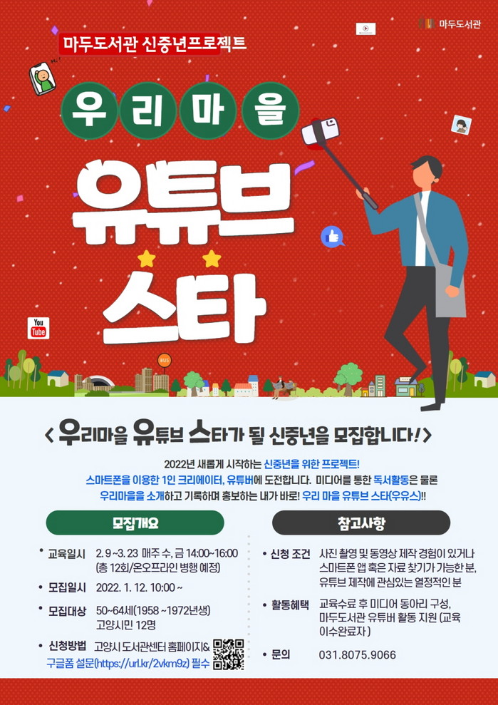‘우리마을 유튜브 스타’의 모집 대상은 만 50세부터 64세(1958~1972년생) 사이의 고양시민 12명이다. 오는 12일(수)부터 고양시도서관센터 홈페이지에서 수강 신청 할 수 있다.