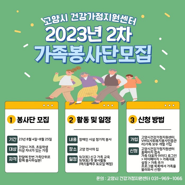 봉사단 참여 문의는 고양시 건강가정지원센터를 통해 알아볼 수 있으며, 참여 신청은 센터 홈페이지에서 가능하다.