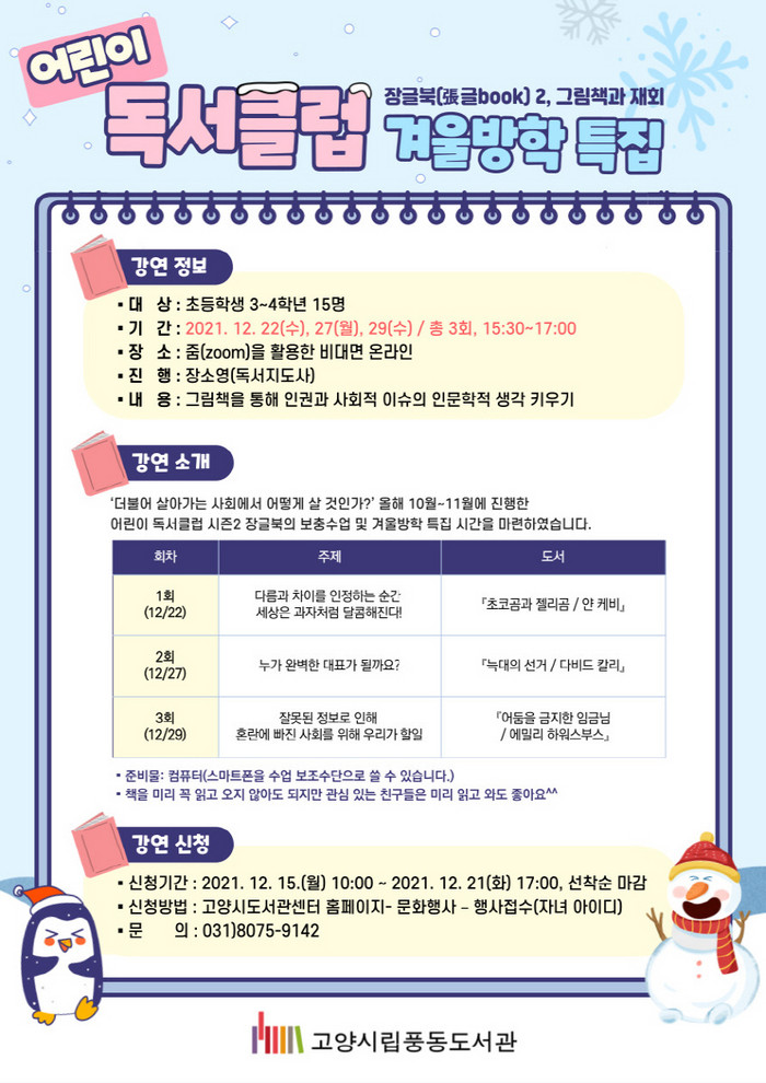 이번 프로그램은 지난 10~11월에 진행한 어린이 독서클럽(장글북(張글book)에 이은 겨울방학 특집 및 보충수업이다. 프로그램은 줌(Zoom)을 활용한 비대면 온라인으로 진행된다.