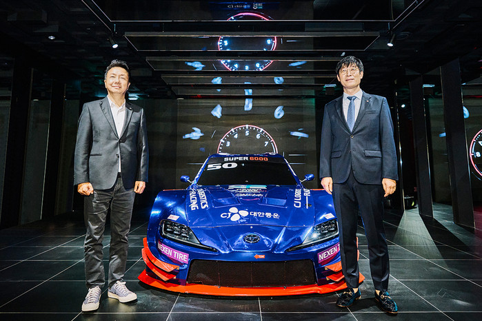 [사진 설명] CJ주식회사 경욱호 마케팅실장(좌)과 롯데월드 아쿠아리움&서울스카이 고정락 부문장(우)이 CJ로지스틱스 레이싱팀 스톡카 앞에서 기념 촬영을 하고 있다.
