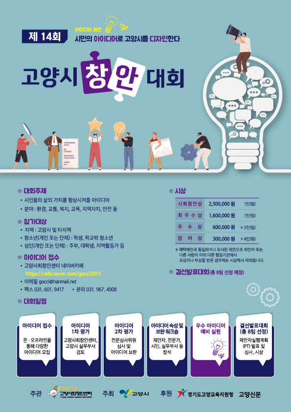 참여 방법은 고양사회창안센터 카페을 통해 응모하면 된다. 기타 자세한 문의는 고양사회창안센터로 하면 된다.