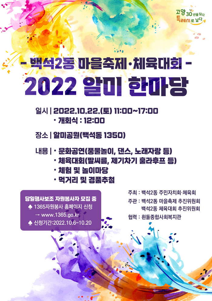 [부자동네타임즈 김인수기자] 고양특례시 일산동구 백석2동 마을축제‧체육대회 추진위원회가 오는 10월 22일(토) 알미공원에서 ‘2022 알미 한마당’을 개최한다.
