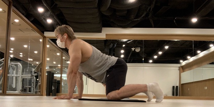 개구리처럼 바닥에 자세를 취한 후 엉덩이를 다리쪽으로 끌어댕기고 원위치 시킨다. 세트 3set. 횟수10회.
