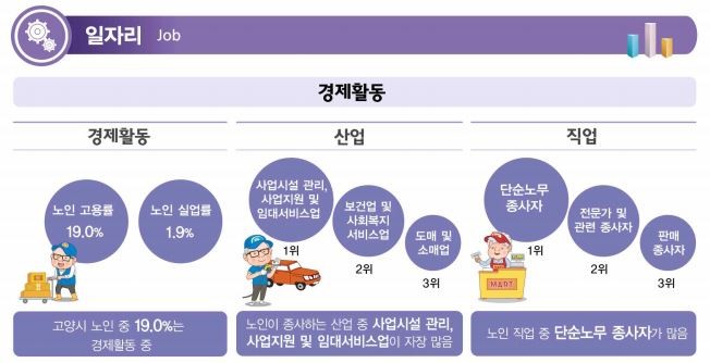 2019년 하반기 고양시 노인 취업자 수는 2만5,400명으로 전년 동기 대비 3천명 증가했으며, 2019년 하반기 고양시 노인의 고용률은 19.0%로 전년 동기 17.9%보다 1.1% 높게 나타났다.