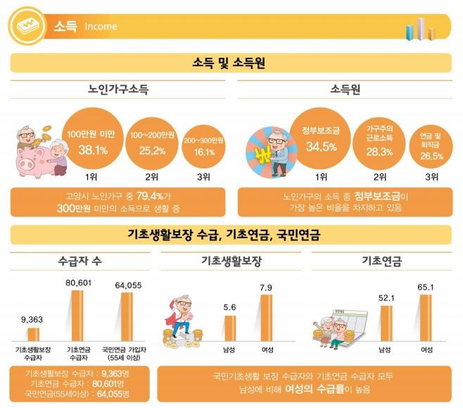 2019년 노인 국민기초생활보장 수급자 수는 9,363명으로 일반 수급자가 8,207명(87.7%)으로 대부분이었으며, 수급가구 중 1인 가구가 5,194명으로 전체 가구의 55.5%를 차지했다.
