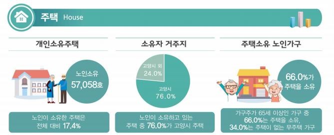 2019년 주택을 소유한 고양시 노인 수는 53,434명이며 이들이 소유한 주택 수는 58,505호로 조사됐다. 단독소유 주택수가 53,720호(91.8%)로 대다수이고 공동소유 주택수가 4,785호(8.2%)로 나타났다. 소유 물건수별로는 1건 46,663명(87.3%), 2건 5,417명(10.1%), 3건이상 1,354명(2.5%) 순으로 집계됐다.
