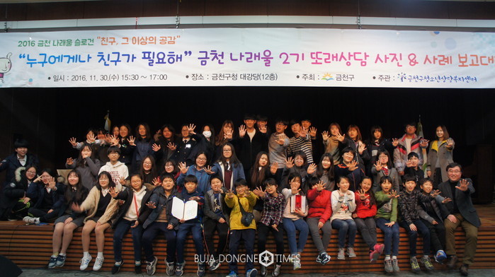 [부자동네타임즈 이병도 기자]금천구(구청장 차성수)가 12월 1일(금) 오후 3시 30분 구청 대회의실에서 금천나래울 3기 청소년또래상담 ‘UCC·우수사례 성과보고대회’를 개최한다고 밝혔다.
