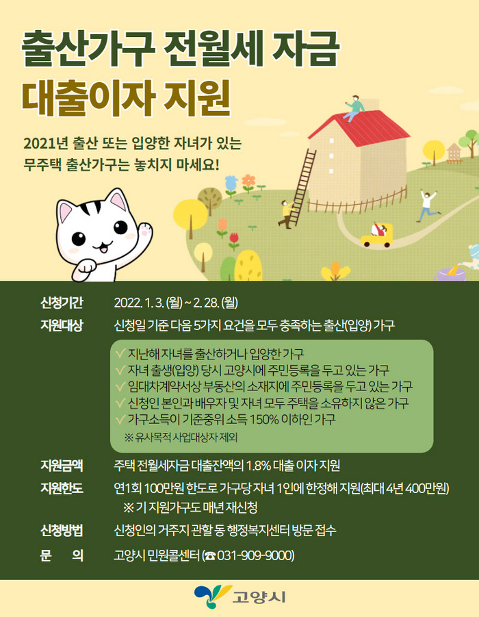 고양시 출산가구 전월세자금 대출이자 지원사업은 지난해 출산 또는 입양한 자녀가 있는 무주택 출산가구에 전월세자금 대출잔액의 1.8%에 해당하는 대출이자를 100만원 한도로 자녀 1인에 한정해 4년간 최대 400만원을 지원하는 제도다.
