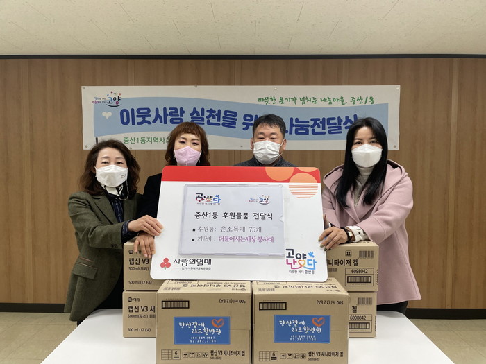 [부자동네타임즈 김인수기자] 일산동구 중산1동(동장 김옥님)은 더불어사는세상 봉사대(회장 이기철)는 지난 23일 저소득 가정에 전달해 달라며 손소독제 100개를 중산1동 행정복지센터에 기탁했다고 밝혔다.