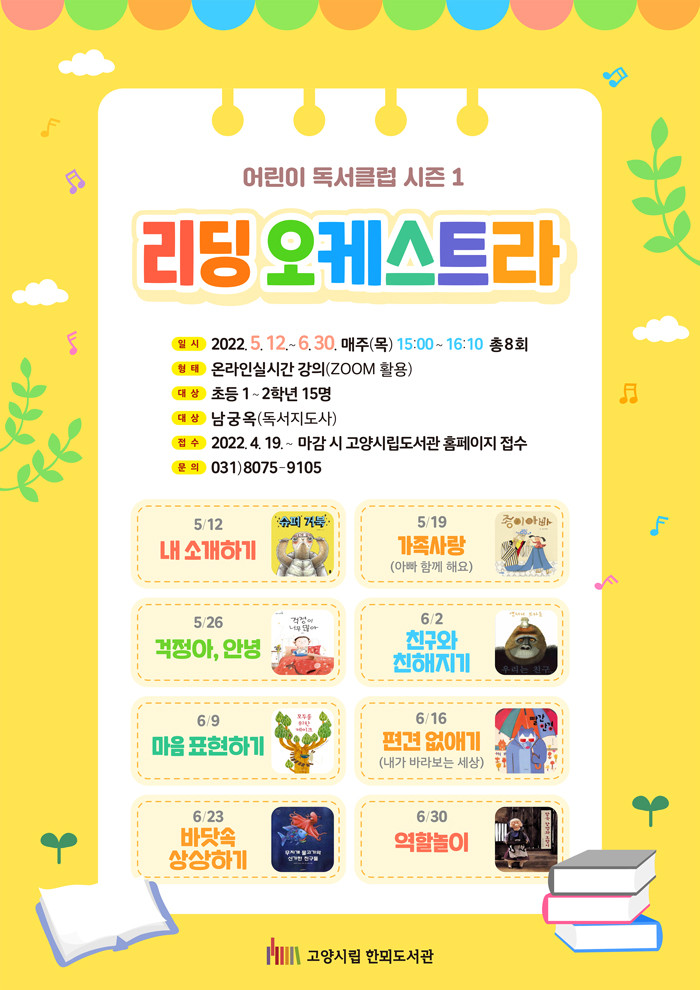 [부자동네타임즈 김인수기자] 고양시 한뫼도서관이 어린이독서클럽 새 시즌 「리딩 오케스트라」를 5월 12일부터 6월 30일까지 온라인으로 운영한다.