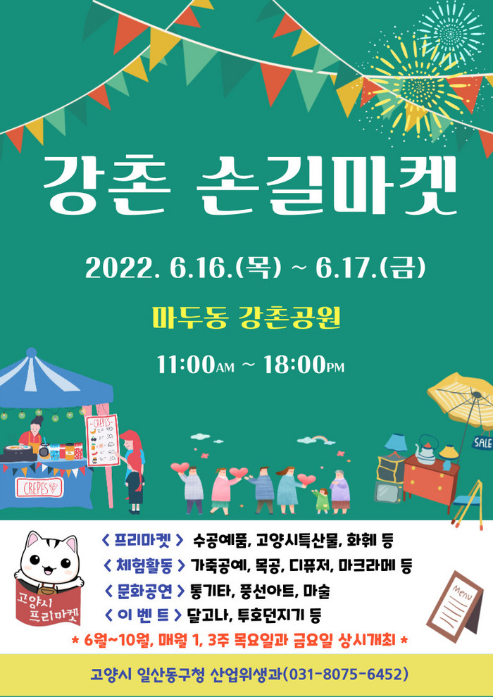 [부자동네타임즈 김인수기자] 고양시 일산동구(구청장 방경돈)는 6월부터 10월까지 마두동 강촌공원에서 매월 첫째, 셋째 목·금요일 수제품 프리마켓인 ‘강촌 손길마켓’을 개최한다고 밝혔다.