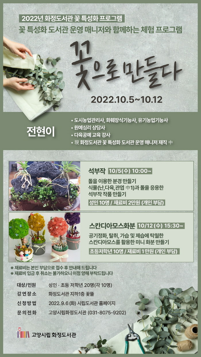 [부자동네타임즈 김인수기자] 고양특례시(시장 이동환) 꽃 특성화 도서관 화정도서관이 10월을 맞아 도서관 매니저가 운영하는 특별 강좌 ‘꽃으로 만들다’를 선보인다.