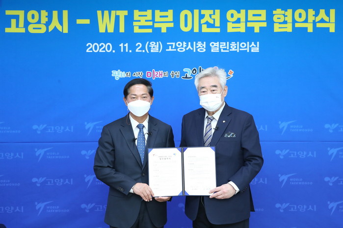 이재준 고양시장과 조정원 세계태권도연맹 총재는 이날 WT본부를 고양시로 이전하는데 최종 합의하는 내용의 업무협약서에 사인했다.