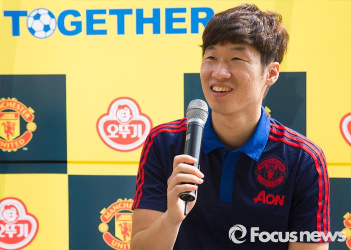 | △ (서울=포커스뉴스) 맨체스터 유나이티드 앰배서더(홍보대사) 박지성이 지난 9월 11일 오전 서울 강남구 대치유수지체육공원에서 열린 '(주)오뚜기-맨체스터 유나이티드 2015 드림사커스쿨'에 참석하여 취재진의 질문에 미소를 짓고 있다. <사진제공=포커스뉴스> |