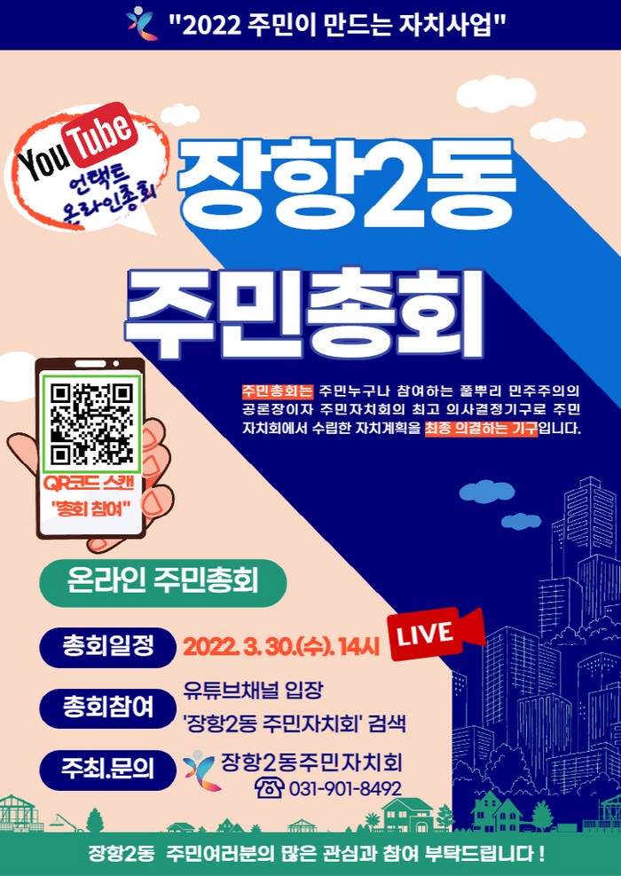 투표 대상은 장항2동 주민등록 거주자, 장항2동 소재 사업장·학교·기관·단체에 속해 있는 만 18세 이상 주민이며, 마을 곳곳에 배포된 홍보전단지 QR코드 스캔을 통해 3월 16일부터 3월 30일 총회 종료 시까지 온라인으로 투표 참여가 가능하다.