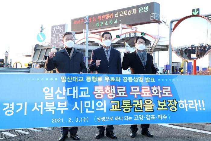 [부자동네타임즈 김인수기자] 이재준 고양시장은 2월 3일 오전 8시, 일산대교 영업소에서 정하영 김포시장 및 최종환 파주시장과 함께 ‘일산대교 통행료 무료화를 위한 공동성명서’를 발표했다.