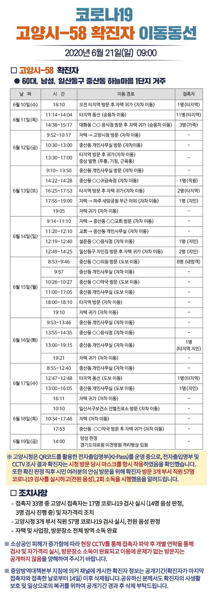 한편 58번 확진자 A씨는 6월 18일 오전 10시 10분 경 일산서구보건소에서 검사를 받아 19일 오전 9시 10분 최종 확진판정 받았으며, 현재 경기도의료원 이천병원에서 입원 치료중이다.