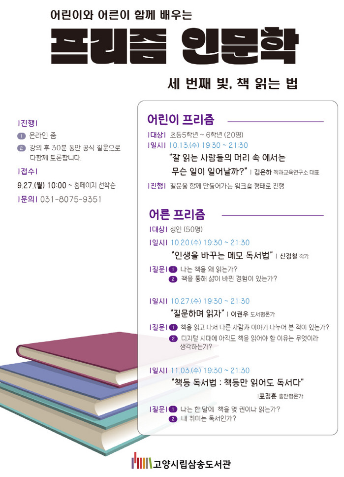 [부자동네타임즈 김인수기자] 고양시 삼송도서관이 오는 10월부터 4주간 ‘독서법’을 톺아보는 특강 프리즘 인문학, 세 번째 빛, 책 읽는 법을 개최한다.