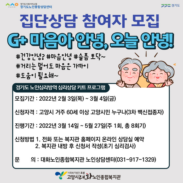 [부자동네타임즈 김인수기자] 고양시대화노인종합복지관(최윤정) 노인상담센터에서는 코로나19 펜데믹으로 심리적 어려움을 겪고 있는 어르신들을 위해 심리방역 상담기트 프로그램 G+마음아 안녕, 오늘 안녕! 집단 프로그램을 준비 중에 있다.