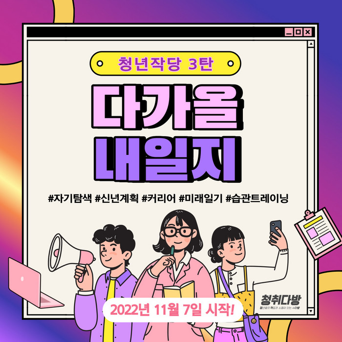 청년작당 프로젝트는 ‘청취다방 2022년 작심삼일은 없당’의 줄임말로, 혼자서는 만들기 어려운 습관을 21일간 함께하는 챌린지로 타파해보자는 취지로 기획됐다.