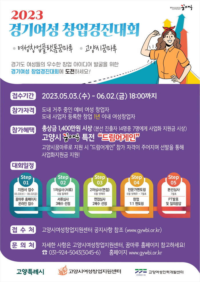 [부자동네타임즈 김인수기자] 고양시여성창업지원센터가 경기도에 거주하는 여성(예비)창업자와 새내기 여성창업자의 창의적 아이디어 발굴과 창업지원을 위한 ‘2023년 여성창업플랫폼 꿈마루 경기여성 창업경진대회’ 참가자를 모집한다.