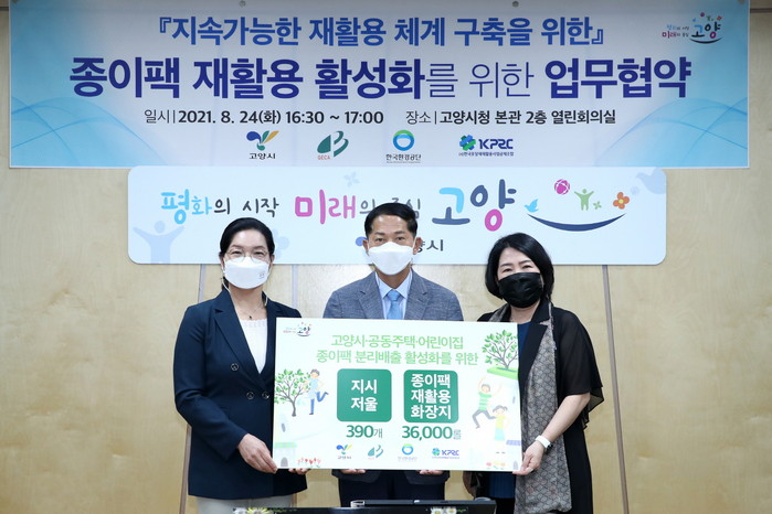 이에 시는 종이팩 분리배출 활성화 업무 협약을 통해 관내 공동주택 총 390개소에 종이팩 등 분리배출에 필요한 20㎏ 지시 저울을 지원하고, 통합고양시어린이집연합회 및 동 행정복지센터에 종이팩 재활용 화장지 36,000롤을 지원하여 공동주택 종이팩 분리배출 체계를 구축했다.