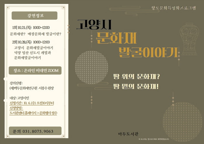 이번 강연은 마두도서관 지하 강의실에서 백두문화재연구원 서봉수 박사가 진행한다. 참가자들은 강연을 통해 땅 속 문화재의 개념과 발굴 과정을 알아보고 고양시의 땅 속에는 어떤 문화재가 숨어 있는지를 살펴보게 된다.