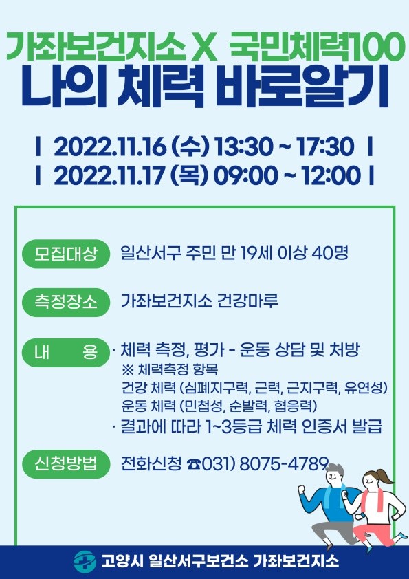 [부자동네타임즈 김인수기자] 고양특례시(시장 이동환) 일산서구보건소 가좌보건지소에서는 고양시 거주 주민을 대상으로‘국민체력100’센터와 협력하여 11월 16일부터 11월 17일까지 가좌보건지소 건강마루실에서 ‘나의 체력 바로알기’를 실시한다고 밝혔다.