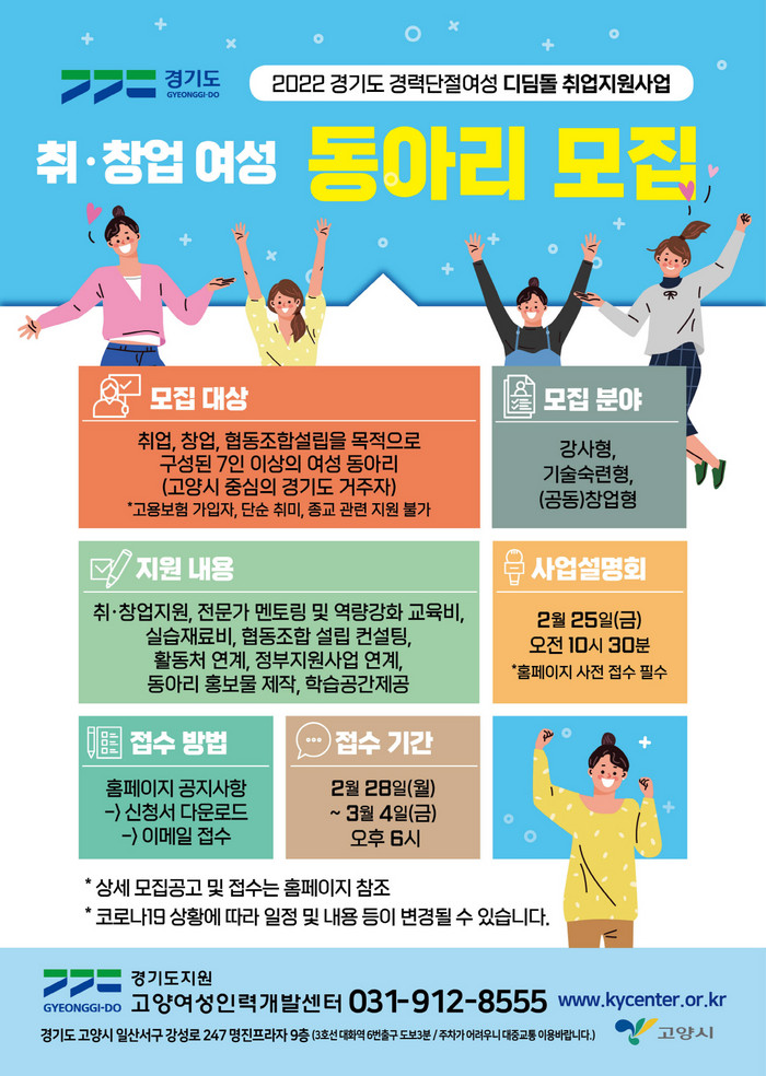 [부자동네타임즈 김인수기자] 고양시 고양여성인력개발센터가 오는 3월 4일까지 2022년 ‘경력단절여성 디딤돌 취업지원 사업’에 참여할 여성 취·창업 동아리를 모집한다.