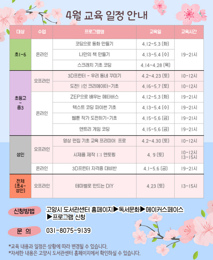 4월 프로그램으로는 코딩으로 동화 만들기, 나만의 책 만들기, 스크래치 기초 코딩, 3D프린터-우리 동네 꾸미기, 도전! 1인 크리에이터, ZEP으로 배우는 메타버스, 텍스트 코딩 파이썬 기초, 웹툰 작가 도전하기, 엔트리 게임 코딩, 영상편집기초, 3D프린터 자격증 대비반 등이 준비되어 있다.