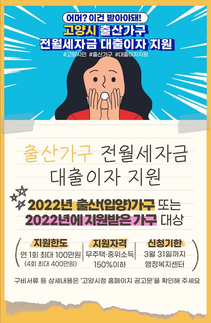 ‘전월세자금 대출이자 지원사업’은 주거비 부담 없이 아이 낳고 키우기 좋은 도시를 만들기 위한 고양시의 특색사업이다. 출산가구의 주거비 부담을 경감하고 안정된 주거환경을 조성하기 위해 2021년 제정된 「고양시 출산가구 전월세자금 대출이자 지원조례」에 따라 운영된다.