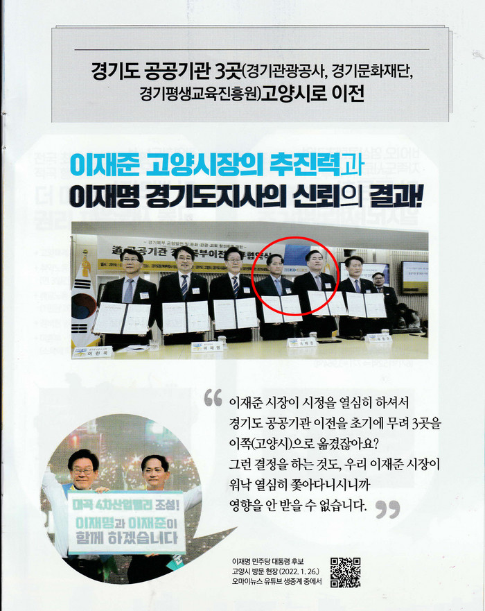 이처럼 민주당 이재준 후보는 경기도 산하기관 3곳의 고양시 유치를 홍보하기 위해 굳이 국민들로부터 원성을 사고 있는 유동규씨와 자리를 함께한 사진을 버젓이 선거공보물 중 중요한 3면에 올려놓은 것은 시민과의 공감 능력이 떨어져 보인다.