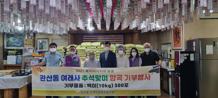 관산동 김성두 지역사회보장 협의체 민간위원장은 “주지스님의 지역사회 이웃사랑실천에 감사드린다”고 화답하며, “모두가 어려운 상황 속에서도 후원해주신 양곡은 도움이 필요한 가정에 전달될 수 있도록 최선을 다하겠다”고 말했다.