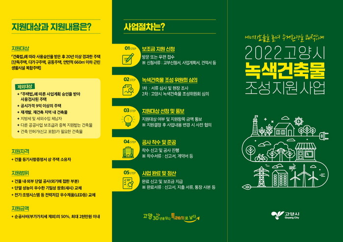 신청 방법은 고양시 홈페이지 공고 및 새소식에 첨부된 관련서류를 내려 받아 작성 후 고양시청 녹색도시담당관 녹색건축팀(경기도 고양시 덕양구 마상로 126번길 91, 줌시티 403호)으로 방문 또는 등기 우편으로 제출하면 된다.