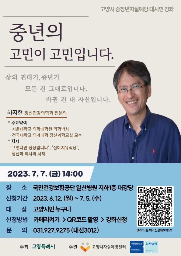 [부자동네타임즈 김인수기자] 고양특례시 일산동구보건소 고양시자살예방센터는 2023년 7월 7일(금) 오후 2시부터 국민건강보험공단 일산병원 지하1층 대강당에서 중장년 대상 강좌 ‘중년의 고민이 고민입니다’를 개최한다.