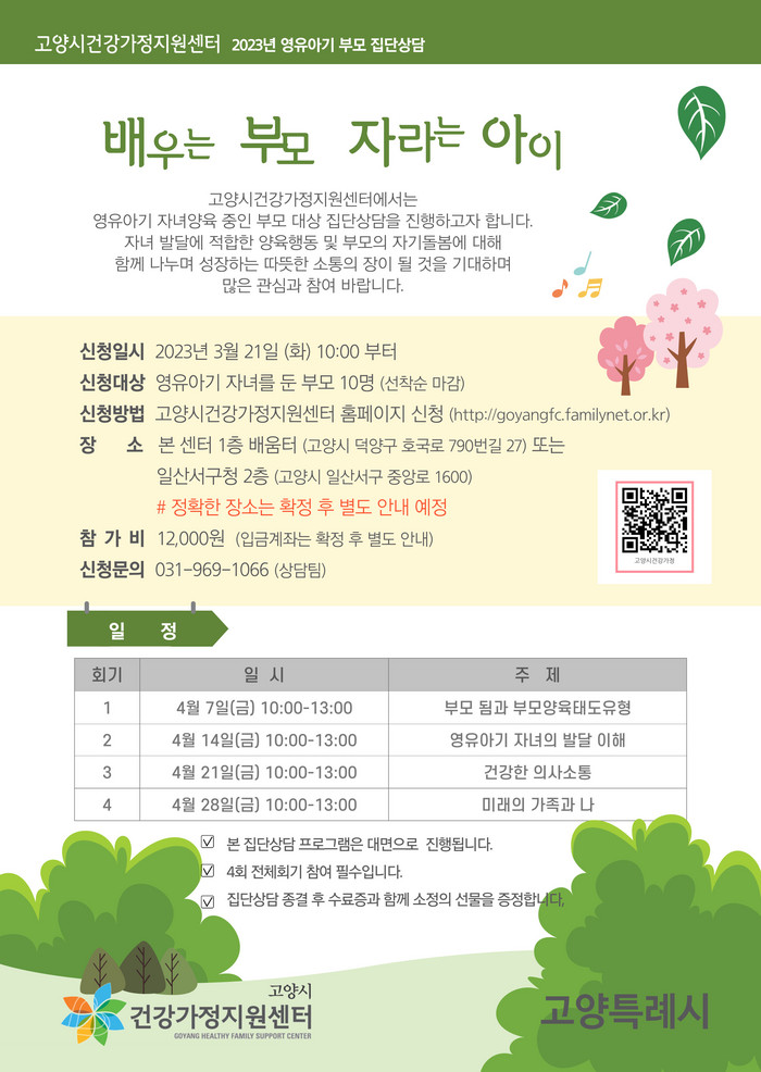 [부자동네타임즈 김인수기자] 고양시건강가정지원센터에서 영유아기 부모 집단상담 프로그램 ‘배우는 부모 자라는 아이’ 을 진행한다.