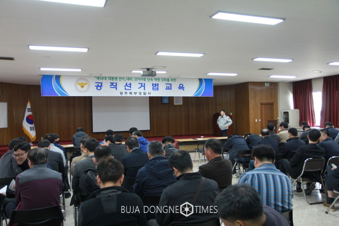 | △북부경찰서 수사과에서는 북부경찰서 대회의실에서 광주 북구 선거관리위원회 최유나 지도계장을 초빙하여 '공직선거법 교육을 실시하였다 |