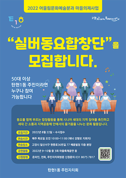 ‘시니어 동요합창단’은 소모임 형태로 연습을 통해 마을 축제 등에서 활동하고 마을 안에서 주민 간의 소통과 함께 즐거움을 나누는 문화 활동을 한다. 참여를 원하는 주민은 탄현1동 주민자치회에 전화(☎031-8075-7817)로 신청하면 된다.