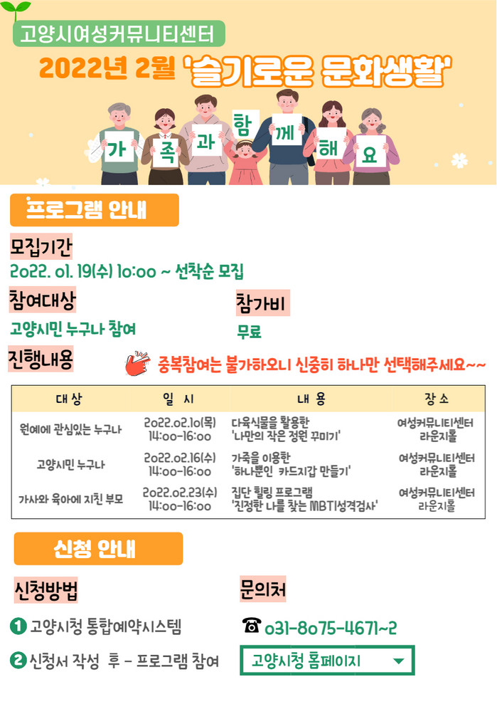 [부자동네타임즈 김인수기자] 고양시 여성커뮤니티센터가 새해를 맞아 2월 10일부터 16일, 23일, 총 3회에 걸쳐 고양시민을 위한 가족친화 프로그램 ‘슬기로운 문화생활’을 운영한다.