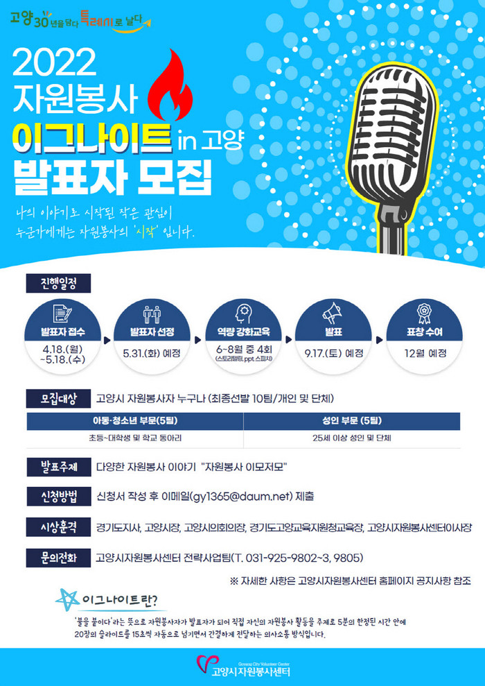 [부자동네타임즈 김인수기자] 고양시자원봉사센터(이하 센터)에서는 오는 18일부터 다음 달 18일까지 "2022 자원봉사 이그나이트 in 고양"에 참가할 발표자를 모집한다고 밝혔다.