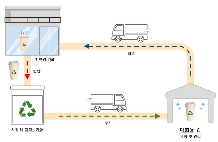 다회용 컵을 이용할 수 있는 커피 전문점은 시 청사 주변 11개소다. 해당 점포에서 다회용 컵을 요청하면 다회용 컵을 대여할 수 있다. 사용한 다회용 컵은 청사 내 6곳의 회수함이나 이용 점포에 반납하면 된다.