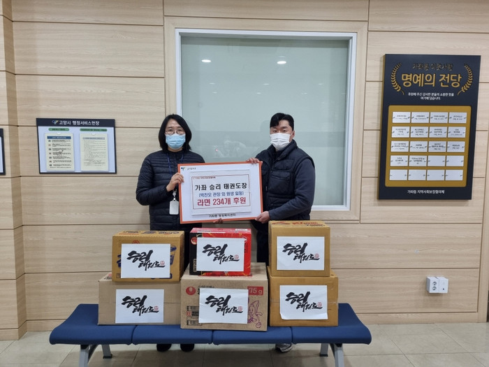[부자동네타임즈 김인수기자] 고양특례시 가좌동 행정복지센터는 ‘가좌 승리 태권도장(관장 박진오)’이 어려운 이웃을 돕기 위해 라면 234개를 기부했다고 밝혔다.