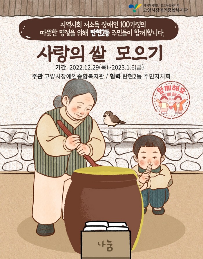 [부자동네타임즈 김인수기자] 고양특례시 탄현2동 행정복지센터와 탄현2동 주민자치회는 이번 달 29일(목)부터 다음달 6일(금)까지 고양시 유일의 장애인종합복지관인 고양시 장애인종합복지관과 함께 ‘사랑의 쌀 모으기 캠페인’을 진행한다고 밝혔다.