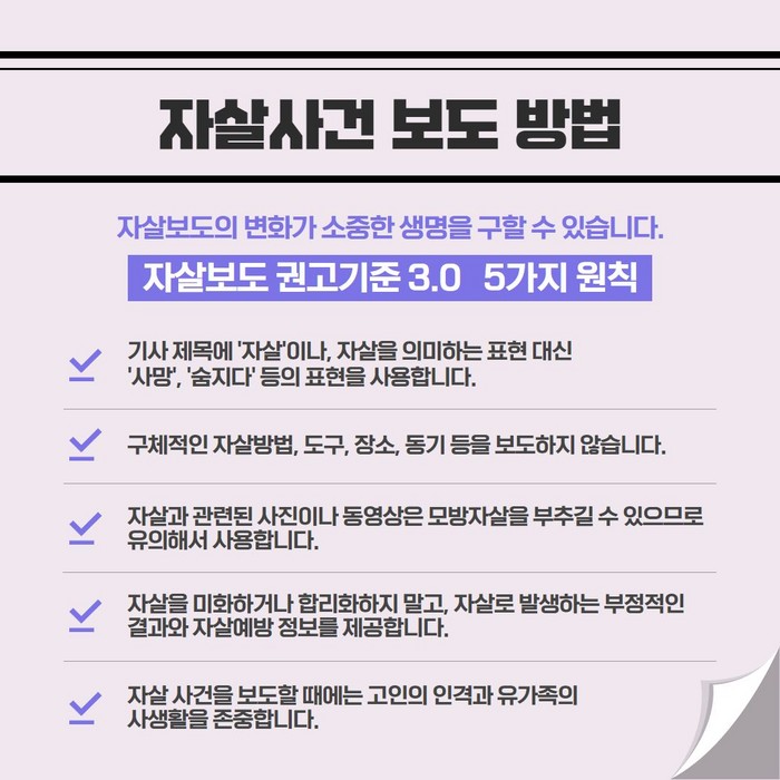 ‘자살 보도 권고 기준 3.0’은 자살 보도의 사회적 책임을 인식하고, 무분별한 자살 보도로 인해 발생하는 2차적인 피해를 예방하기 위해 보건복지부, 한국자살예방협회, 한국기자협회가 공동으로 추진하고 있다.