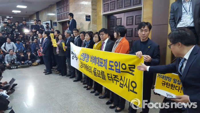 | △ 정의당 의원들이 여야 4+4 회동이 열린 국회 의원식당 앞에서 연동형 비례대표제 도입을 주장하고 있다. <사진제공=포커스뉴스> |