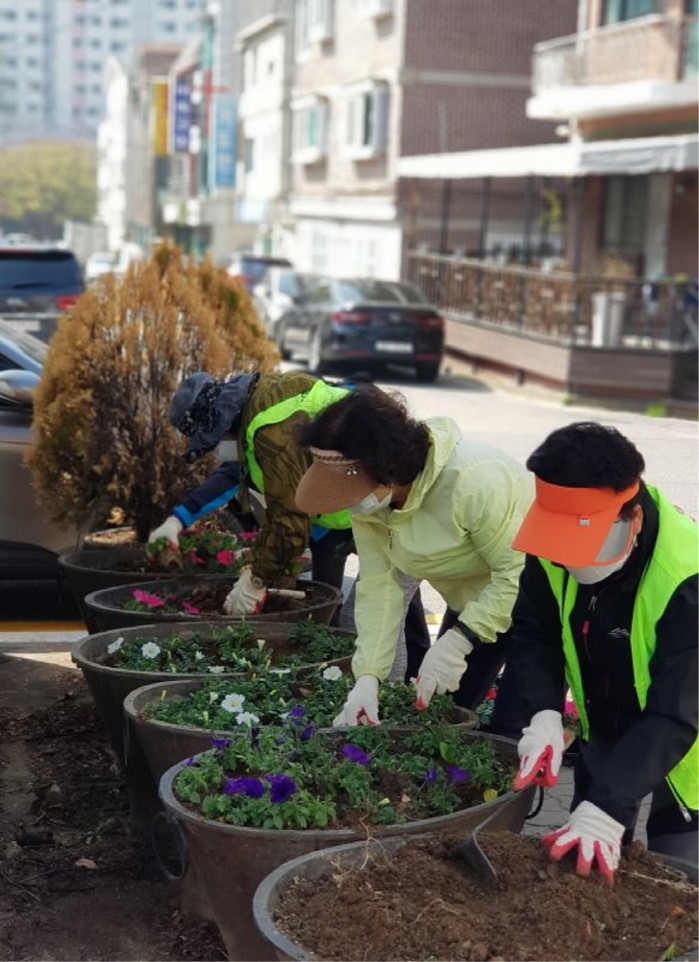 이번 활동은 조경순 주민자치위원장을 비롯한 위원 10여 명 등이 참여한 가운데 ‘코로나19에도 봄은 찾아온다’라는 소주제로 동 행정복지센터 입구와 주요 도로변 등 탄현동 관내 일대에 봄꽃 600여 본을 식재해 아름다운 꽃길 조성에 힘썼다.